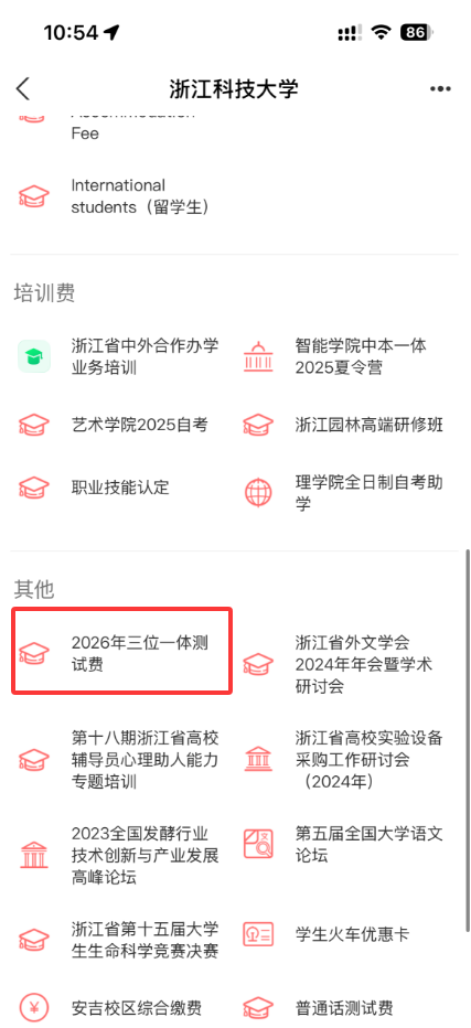 (二)缴费安排:2026年3月31日—4月8日17:00,网上缴费(手机打开支付宝--查找“浙江科技大学"--点击“生活号”--进入缴费大厅--点2026年三位一体测试,输入考生姓名及身份证号,咨询电话0571-85070165)。